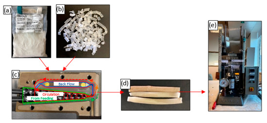 Material preparation: (a) powdered silica, (b) polymer sample, (c) twin-screw extruder (top view), (d) extruded filament, and (e) compression molding machine.