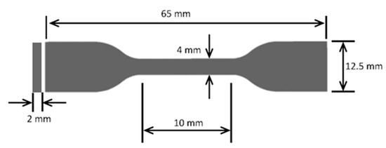 Dumbbell-shaped tensile test specimens were prepared using the blanking machine. The dimensions (i.e., the length (l), width (w), and thickness (t)) of each set of the composite samples are presented in Table 1. The varying thicknesses of the pieces can be directly attributed to the processing of the polymers themselves. The corresponding mechanical properties were investigated using a 10 kN load cell with a 5-mm/min crosshead motion. Five replicates measurements were performed for obtaining increased accuracy, which is represented as standard deviations (SDs) in the plots of the results. Figure 3 shows the dimensions of one of the tensile test specimens, and Figure 4 shows the blanking process and the tensile testing machine.