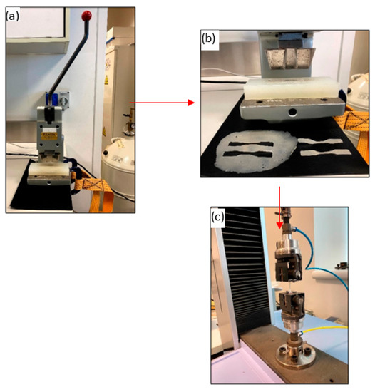 (a) Blanking machine; (b) Dumbbell shape samples after blanking process (c) Tensile testing machine with a sample.
