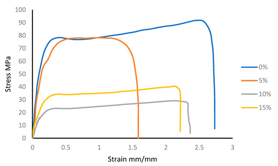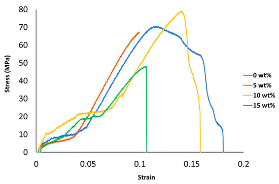 The elastic modulus (E) and yield stress associated with all the samples are shown in Figure 10 and Figure 11. In the case of PP, E gradually decreased from 72 MPa at 0 wt% to 41 MPa at 15 wt%. A similar behaviour was observed for its yield stress values (Figure 11). This decrease in mechanical property with the increasing filler amount is associated with the agglomerates in the filler matrix. Thus, stress concentrations are induced at several locations in the composite material, reducing the filler-aspect ratio. This further decreases the area available for forming a contact surface between the filler and matrix, leading to the formation of tactoids [72].