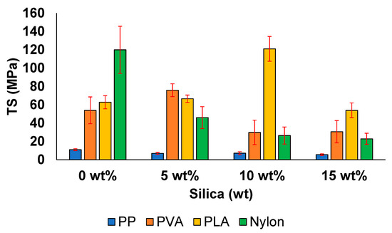 Figure 7 shows that the TS of the samples increases with the addition of silica particles. In case of PP, the addition of silica results in a gradual decrease of the TS from 11.01 MPa at 0 wt%, which is similar to the value of 5.63 MPa obtained at 15 wt% mentioned in the literature [72]. However, the TS value slightly increases from 6.96 MPa at 5 wt% to 7.15 MPa at 10 wt%. This behaviour of PP has been previously reported to occur at a silica content of approximately 3 wt%. This behaviour is likely to be associated with the stiff layers of silicate, which have a high aspect ratio, causing a high degree of interaction and suitable interfacial adhesion property. In addition, this behaviour contributes to the restriction of the free mobility of the polymer chains, increasing the TS value [72,73].