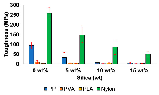 Figure 8 presents the toughness of the prepared composite materials. The toughness values of the PP and nylon samples are considerably greater than those of the PVA and PLA samples. The toughness, which is a measure for absorbing energy, decreased from 95 MPa at 0 wt% silica to 6 MPa at 15 wt% silica in case of PP. This decrease can be attributed to the agglomerates that affect the structural stability of the prepared composite materials, reducing the absorption of impact energy by the material and inducing crack formation at the interface of the material. To address this issue, several researchers have incorporated modifying agents that improve the impact resistance of materials [72,76].