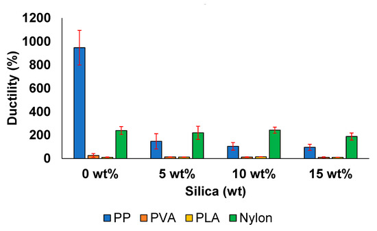 Similar to the PP and PVA samples, the nylon samples exhibited a steady decrease in ductility with the increasing silica concentration. The ductility of the 0 wt% silica sample was 239%, whereas that of the sample with 15 wt% silica was 188%. This trend has also been observed in other studies [29]. The combination of a ductile polymer with short, brittle particles or fibers has been reported to result in lower strain values at the failure point compared with the strain values of neat polymers.