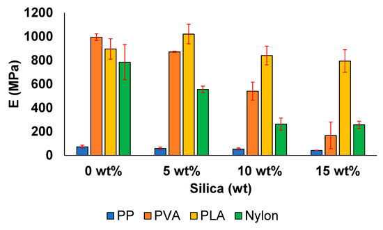 All the other samples exhibit a relatively higher E value and yield stress when compared with the samples prepared with PP. For instance, in case of PVA, the E values and yield stress decreased from 995 and 16 MPa at 0 wt% to 167 and 10 MPa at 15 wt%, respectively. The inability to form stronger bonds with the addition of the filler leads to a decrease in the E value with the increasing silica content, which has also been previously reported [27].