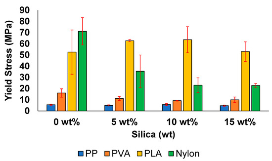 The obtained DSC data were used to characterize the intrinsic thermal properties of the materials. For example, an increase in the filler concentration did not considerably affect the Tm, glass-transition temperatures (Tg), or crystallization temperatures (Tc) of the samples. Once the Tc, Tg, and Tm values are determined, the range of processing temperatures can be identified, providing a reasonable estimation of the suitability of the materials for industrial applications. The most common industrial processing temperature is ±40 °C [46,49]. In addition, when the Tc and Tm values of the materials are known, the enthalpies of the materials can be estimated, providing an understanding regarding how much energy and heat would be required in the manufacturing process for such composite materials, which is an important consideration from the industrial manufacturing perspective. The Tg value for PP ranged from 41 °C to 57 °C (reaching a maximum at 10 wt% filler concentration), which is slightly lower than the values reported elsewhere [5]. In the case of PVA and PLA, the Tg values ranged from 44 °C to 67 °C and from 52 °C to 58 °C, respectively, as reported for other PVA and PLA systems [84], with the highest Tg values being observed for the samples with 15 wt% silica in both the cases. In case of nylon, the Tg varied from 31 °C to 42 °C, with the highest value being obtained for the sample with 10 wt% silica. In any silica-containing sample, the Tg value of which increased compared with that of the pure polymer, silica particles may have prevented the thermal motion of the polymeric chains, resulting in the above phenomenon [27].