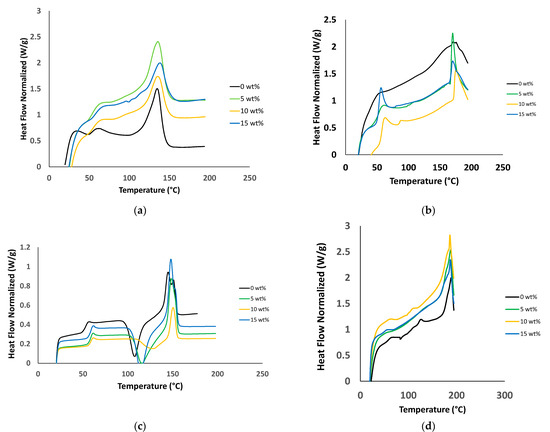 DSC analysis was carried out at a heating rate of 10 °C/min on all the prepared sets of composites to elucidate their crystallization behaviours. Figure 12 shows the melting peaks (Tm) obtained from the DSC thermograms. The observed Tm for pure PP is 135 °C, which is slightly lower than the value reported for PP [5]. The Tm for pure PVA is 171 °C, which is in agreement with the value reported in the literature [84]. For PLA, two melting peaks were observed at 145 °C and 150 °C, consistent with the literature. These two peaks can be attributed to the coexistence of two PLA crystal structures known as the α and β forms. The α form is the peak at a higher value because of the better quality and size of crystals [84]. A sharp peak is observed at 189 °C in the thermogram of nylon [57]. A smooth transition temperature trend is observed for all the PLA samples, indicating that the pure PLA sample does not contain impurities. Furthermore, the addition of filler does not substantially change Tm. The slight variations in the shapes of the curves are likely associated with the degree of crystallinity in each sample [25], implying that the overall thermal stability of the composite material is maintained.