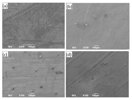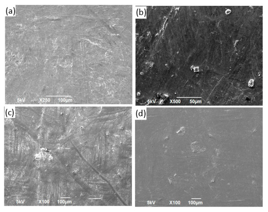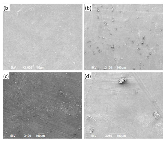 In case of the PP/silica samples, a smooth surface is observed at 0 wt% silica. An increase in the number of randomly dispersed silica particles can be observed on the surface of the samples with 5 and 10 wt% silica, as evident in Figure 13b,c, respectively. Clumped particles are observed on the surface of the sample with 15 wt% silica (Figure 13d), indicating agglomeration. Similar behavior has been reported for PP/silica composites with similar silica loadings [90]. For PVA, increased dispersion is observed with increasing silica loading from 0 to 10 wt% (Figure 14a–c). For the samples prepared with PLA, good dispersion is observed at 5 and 10 wt% silica loadings (Figure 15b,c, respectively). The excellent distribution in these samples reflects the enhanced properties at these concentrations. At 15 wt% silica (Figure 15d), larger particles begin to appear at greater distances from each other. These particles correspond to agglomerates. A similar trend of random dispersion is also observed in the samples prepared from nylon (Figure 16). In addition, the SEM images indicate that in all of the samples, the particles are just settled in the matrix and not homogeneously mixed or well bonded to the matrix. The interaction and adhesion of the particles with the matrix are properties that require further study because they can strongly affect the enhanced mechanical and thermal behaviors of composite materials.