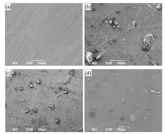 Images obtained using an SEM for PLA/silica samples containing (a) 0 wt%, (b) 5 wt%, (c) 10 wt%, and (d) 15 wt% silica.
