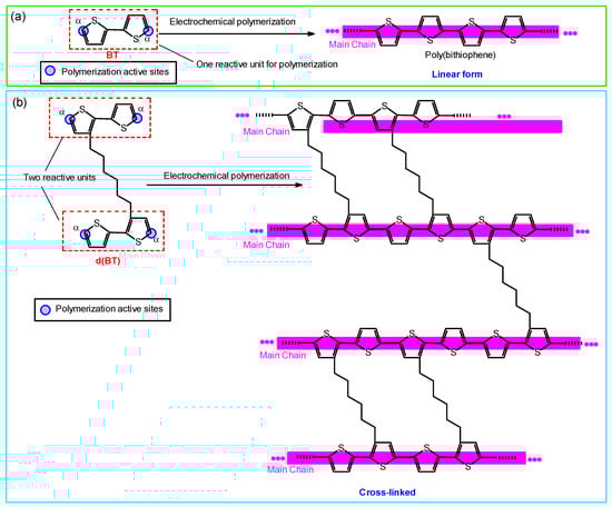 BT, d(BT), DTC, bis(DTC), DTB, bis(DTB), DTB2, and DTB4 as monomers were used in this study. BT, DTC, and DTB have one reactive unit (conjugated backbone) with two reactive sites (α-position of the thiophene unit) in each molecule, while d(BT), bis(DTC), and bis(DTB) have two independent reactive units with four reactive sites (α-position of the thiophene units) in each molecule. These characteristics allow d(BT), bis(DTC), and bis(DTB) to form a crosslinked polymer structure, and copolymerization with BT, DTC, and DTB can tune the degree of crosslinking. Compared with DTB, DTB2 and DTB4 have the same conjugated backbone but different alkyl side chain lengths. They were used for further investigation in the examination of molecular form influence. Plausible uncrosslinked and crosslinked forms are described in the polymerization of BT and d(BT), as an example (Figure 1).