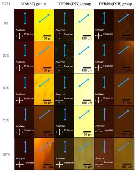 In the LD spectra of the DTB/bis(DTB) group, when the RCU was 0%, the dashed line showed a higher intensity, which indicates that the main chain orientation was perpendicular to the LC orientation. This is the perpendicular orientation. When the RCU was in the range of 30–70%, the solid line and the dashed line had roughly the same intensity, which suggests that the orientation degree of the polymers was low. When the RCU was 100%, the solid line gave a higher intensity, which means that the polymers were in a parallel orientation. For a better understanding of the effect of RCU on the orientation degree, a linear dichroism ratio (LDR) was summarized for all samples to evaluate the orientation degree. The LDR was calculated according to the following equation: