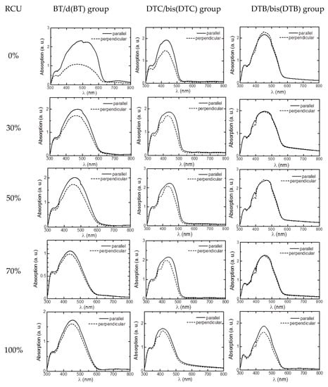 In linearly conjugated polymers, the transition dipole moment is along the main chain. The electronic transition probability is along the direction proportional to the inner product between the dipolar transition moment and the electric vector of the incident light. If the polarization direction of the incident light is parallel to the main chain of a conjugated polymer, the maximum absorption intensity can be observed. Therefore, the main chain orientation of conjugated polymers can be defined using linear dichroism (LD) UV–vis absorption spectroscopy. The LD measurement for every sample was carried out two times in different orientations using a polarizer. One orientation was parallel to the LC orientation and the other was perpendicular to the LC orientation. If one of the two orientations shows a higher absorption intensity than the other, it indicates the main chain orientation of the polymers. Figure 4 shows the LD UV–vis spectra of all the samples. In each spectrum, the solid line represents the absorption intensity for an orientation that is parallel to the LC orientation, and the dashed line indicates the absorption intensity for an orientation that is perpendicular to the LC orientation. In the spectra of the BT/d(BT) group and the DTC/bis(DTC) group, higher intensities were observed for the solid lines, indicating that the main chain orientation was parallel to the LC orientation. This is the parallel orientation. With an increase in the RCU, the intensity difference between the solid line and the dashed line decreased. This indicates that the increased proportion of crosslinked monomers resulted in a decrease in the orientation degree in this case.