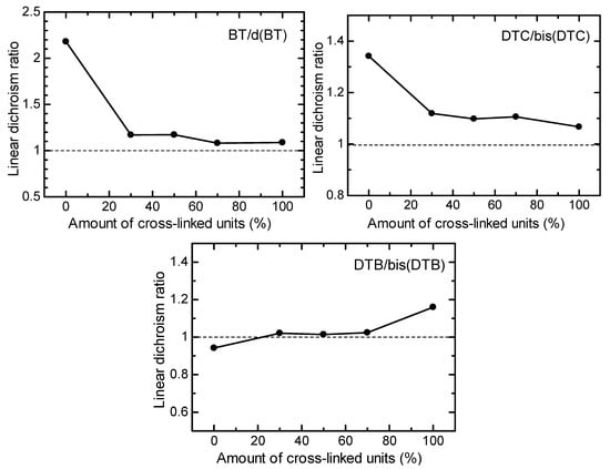 LDR of polymer films obtained from the BT/d(BT) group, DTC/bis(DTC) group, and DTB/bis(DTB) group with different RCUs. LDR: Linear dichroism ratio. RCU: Ratio of crosslinked units.
