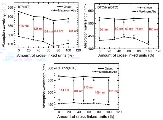 Crosslinking affects not only the molecular orientation degree of polymers, but also their optical properties. The maximum absorption wavelength and the onset wavelength in the absorption spectra are two important parameters for evaluating the optical properties of a polymer. The maximum absorption wavelength and onset wavelength of the polymers are summarized in Figure 7. With a change in the RCU, the BT/d(BT), DTC/bis(DTC), and DTB/bis(DTB) groups showed completely different tendencies, which indicates the complexity of the crosslinking effect. For the BT/d(BT) group, an increased RCU resulted in a decrease in the onset and maximum absorption wavelengths; in the DTC/bis(DTC) group, the onset wavelength marginally changed while the maximum absorption wavelength first increased and then decreased; in the DTB/bis(DTB) group, the onset wavelength and maximum absorption wavelength changed in opposite directions. Given that the polymers formed within the same group have the same conjugated backbone structure, the change in the optical spectra may be due to three reasons: degree of polymerization, coplanarity of the conjugated backbone, or intermolecular interaction. When crosslinked monomers were added to the polymerization system at various concentrations, all three factors changed. It is most likely that the crosslinking effect changed the optical properties of the polymer films by affecting the molecular weight, coplanarity, and intermolecular interaction, simultaneously.