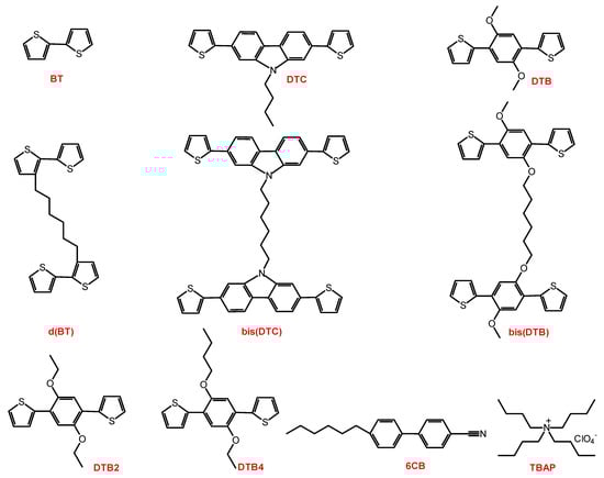 Monomers employed for the electrochemical polymerization in liquid crystals, and molecular structures of liquid crystal 4-cyano-4′-hexylbiphenyl (6CB) and the supporting salt tetrabutylammonium perchlorate (TBAP).