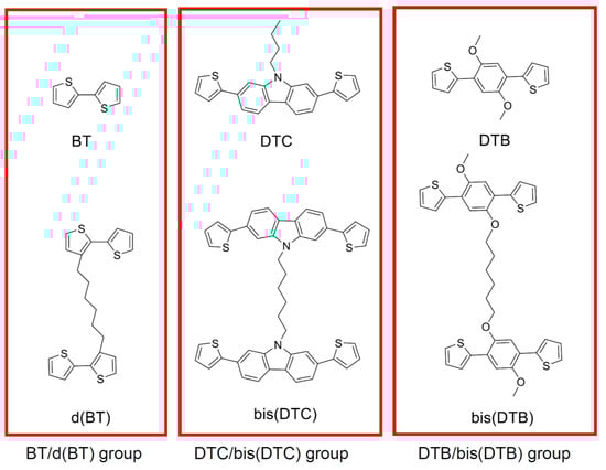 Eight types of monomer were used, including 2,2′-bithiophene (BT), 1,6-di(2,2′-bithiophen-3-yl)hexane (d(BT)), 9-butyl-2,7-di(thiophen-2-yl)-9H-carbazole (DTC), 1,6-bis(2,7-di(thiophen-2-yl)-9H-carbazol-9-yl)hexane (bis(DTC)), 1,4-dimethoxy-2,5-di(thiophen-2-yl)benzene (DTB), 1,6-bis(4-methoxy-2,5-di(thiophen-2-yl)phenoxy)hexane (bis(DTB)), 1-ethoxy-4-methoxy-2,5-di(thiophen-2-yl)benzene (DTB2), and 1-butoxy-4-methoxy-2,5-di(thiophen-2-yl)benzene (DTB4), and they are shown in Scheme 1. In addition, the matrix LC 4-cyano-4′-hexylbiphenyl (6CB) and the supporting salt tetrabutylammonium perchlorate (TBAP) are shown in Scheme 1. The syntheses of the monomers d(BT), bis(DTC), DTB, bis(DTB), DTB2, and DTB4 are illustrated in Scheme 2. The synthesis of DTC was reported in our previous work []. The monomer BT and the supporting salt TBAP were purchased from Tokyo Chemical Industry (TCI). The LC 6CB was purchased from Merck. All other necessary chemicals were purchased from TCI, Wako Pure Chemical, Nacalai Tesque, and Sigma-Aldrich.