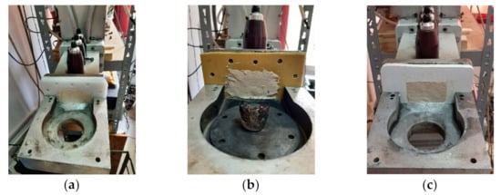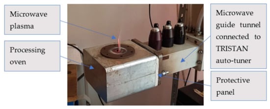 As already specified, the protective panel is proposed to be inserted into the microwave guide tunnel, in order to create a barrier against the plasma produced by the ionizing of the gas in the oven, during the interaction between the microwave beam and the piece to heat or between the microwave beam and the walls of the oven. The protective panel is transverse positioned on the wave guide tunnel and its dimensions were considered according to the geometry and structure of the microwave guiding tunnel connected to the matching load impedance auto-tuner TRISTAN 6 kW (Figure 2) [] driven by HOMER software (producer of the entire system is MUEGGE GmbH, Reichelsheim, Germany). The heating environment was simple air, and the room temperature was 22 °C for all experimental steps.