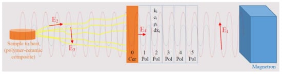 In the same time, the polymeric panel is subject to heat incidence coming by conduction from the ceramic layer of the composite, only. The polymer does not absorb microwaves, so the energetic amounts E1 and E3 refer to the ceramic layer and do not affect the polymer part of the composite.