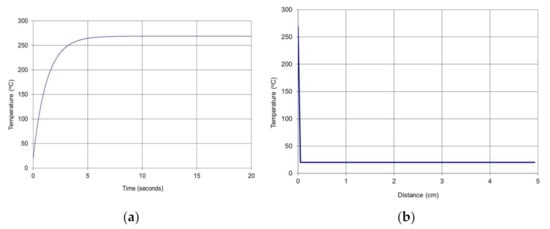 It can be observed in Figure 9 that the penetration of the heat is about 4 mm for temperatures above 250 °C, about 6 mm for temperatures above 200 °C, and about 8 mm for temperatures above 130 °C. The side of the panel oriented to the magnetron keeps to be at temperatures below 50 °C. That means that the protective panel has appropriate behavior.