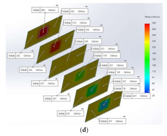 FEA simulation of the geometrical model: (a) Geometrical model of the composite; (b) Thermal field on thickness; (c) Temperature plots; (d) Thermal field on surfaces of each element of thickness considered.