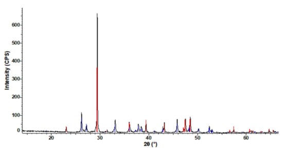 The crystalline phases present in the RT powder were identified by X-ray diffraction (XRD) using Bruker D8 ADVANCE diffractometer (Billerica, MA, USA) []. The data processing was done with the help of the DIFFRAC.EVA VER.5 2019 program and the ICDD database PDF4 + 2021 [].