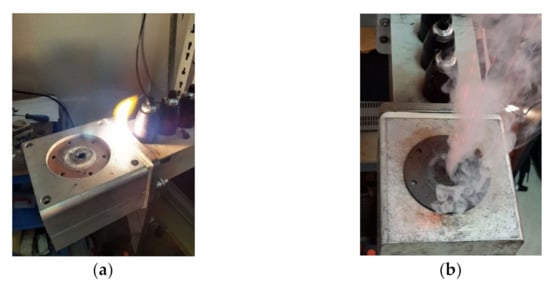 During preliminary tests, experience of burning with open flame and emissions of fume (Figure 11) proved that the power was appropriate for testing, due to the existence of the plasma discharge. For 1.2 kW and 0.6 kW input power the plasma discharge did not performed outside evolution, and the amount of fume emission was almost not existent. The two levels of power proved to be more than enough to melt the PTFE from the probe and to produce the desired composite.