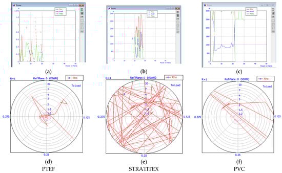For higher amounts of power, the process was difficult to be controlled and the penetration of the protective panel was almost on the entire thickness. The images (a), (b), and (c) of Figure 12 show the power curves (incident, reflected and absorbed) for the three types of protective panels using RT layer, and for 3 kW input power. In less than 20 s the plasma discharge appeared and hit the protective panel. Image (a) of Figure 12 shows that in the case of PTFE the process has higher stability. The images (d), (e), and (f) show the Schimdt curves of stability. For PTFE case the process is very stable, since the curves are in the center of the circle, which is different from the STRATITEX case when the process is out of control. In the case of STRATITEX, TRISTAN impedance matcher is almost unable to adjust the stubs in order to reduce the reflected beam.