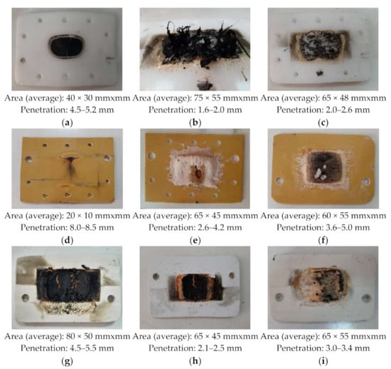 Examples of burned samples, input power 3 kW, burn time 20 s, PTFE+RT mixture to melt: (a) PTFE, no ceramic layer; (b) PTFE, RT layer; (c) PTFE, beach sand layer; (d) STRATITEX, no ceramic layer; (e) STRATITEX, RT layer; (f) STRATITEX, beach sand layer; (g) PVC, no ceramic layer; (h) PVC, RT layer; (i) PVC, beach sand layer.