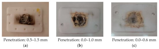 For the lowest two levels of input power (1.2 kW and 0.6 kW) the entire heating process was very stable and the protective panels were affected by penetration of 0.0–1.0 mm, and respectively 0.0–0.6 mm (Figure 14).