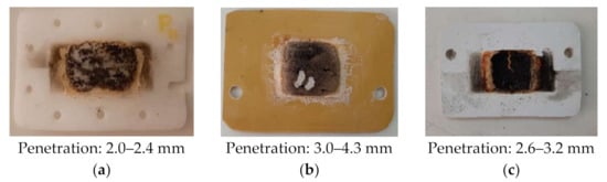 Important amount of energy, participating to the plasma discharge, comes from the material subjected to heating. That influences the interaction between the plasma and the protective panel, and it is considered here the penetration of the panel. Since the RT layer proved the best behavior during the interaction with the plasma and with the incident microwave beam, an experiment without sample to be heat was performed. That was necessary to better understand all the influences. The burned samples are presented in Figure 15a–c and it can be seen that the penetration is max 10% lower than the previous tests, when sample of PTFE-RT was positioned in the oven.