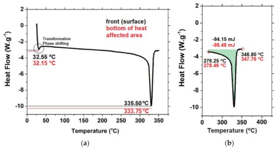 DSC analysis of the protective panel’s material (black-material on the surface of the affected side, and red—material on the bottom of the affected, on the same side): (a) Critical temperatures: melting temperature and phase transition temperature; (b) and the specific temperatures: melting start and liquidus temperature.