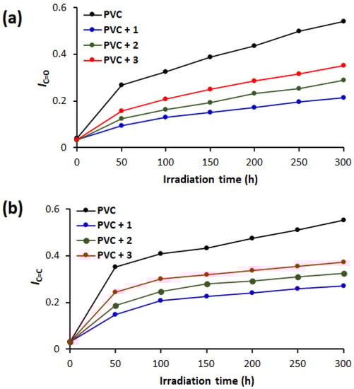 - Kaczmarek, H.; Kowalonek, J.; Ołdak, D. The influence of UV-irradiation on poly(vinyl chloride) modified by iron and cobalt chlorides. Polym. Degrad. Stab. 2003, 79, 231–240. [Google Scholar] [CrossRef]