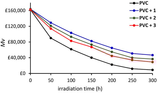 2.7. Assessment of PVC Photodegradation by Average Molecular Weight ()