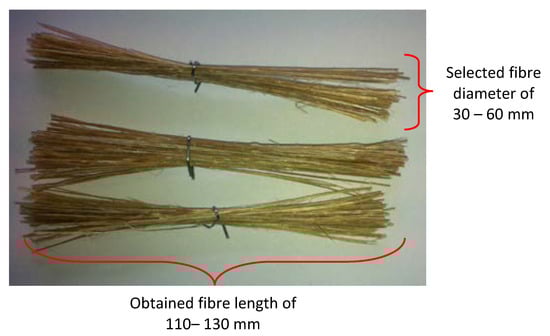 The bamboo fibre for this study was extracted using a manual method, given that some researchers have proved that manually extracted fibres show increased fibre density properties than do chemically extracted fibres. The node parts and the thin layers of bamboo bark were cleaned manually, and only the cylinder culm that contains the bamboo fibres was retained. Later, the cylinder culm was peeled down to obtain strips of different lengths and diameters. All strips were than soaked in 6% Sodium Hydroxide solution to treat the fibres for a duration of 24 h. The main idea here is to remove the lignin layer on the outer fibre surfaces as it acts as a wax thereby lowering surface wettability of the fibre/resin. Then, the fibres were taken out from the treatment and rinsed with distilled water to remove the excess impurities trapped within the fibres and remaining sodium hydroxide. It should be noted here that tap water is not used at this stage as it contains chlorine which can react with sodium hydroxide and modify the chemical properties of the bamboo fibres. Figure 1 shows the significant effects before and after treating the bamboo fibres with 6% NaOH. From the figure, it can be seen that the outer layer of the bamboo fibre surface is rougher after the treatment. This is a crucial factor during the dry sliding wear tribological test since the possibility of fibre to detach from the resin due to the sliding wear is low; i.e., good fibre/resin interfacial adhesion strength. The treated bamboo fibre strips were than left to dry at room temperature at 28 ± 5 °C for 24 h. When the fibres were completely dried, they were carefully selected under a 10x NK Vision microscope for diameters between 30–60 mm; Figure 2. This was done to ensure the homogenous dispersion of fibres during the fabrication process. All fibres had been post cured in an oven for 5 h at 45 °C and at a humidity level of 80 ± 10% to ensure proper drying of fibres and to enhance surface wettability of the fibres with the epoxy matrix. More information on the bamboo fibres extraction process is available at [2]. The density of the bamboo fibres was determined to be about 910 kg/m3, respectively. Table 2 illustrates some important information on the chemical and physical properties of the harvested bamboo fibres [21,22]. Table 3 presents the mechanical properties of the bamboo fibre and bamboo fibre/epoxy resin at different operating parameters [23,24].