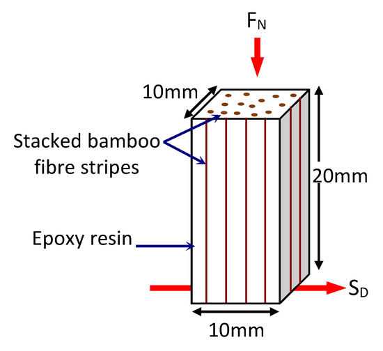 Schematic illustration of the Stalked Bamboo Fibre Reinforced Epoxy (S-BFRE) composite test specimen. Note: FN—Applied Normal Load; SDSliding Direction.