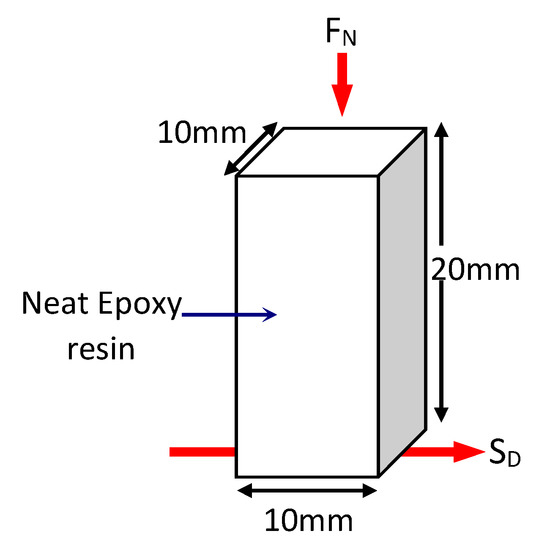 For the purpose of conducting the tribological tests, test specimens with dimensions of 10 mm × 10 mm × 20 mm had been prepared from the cured composite block using a Black and Decker jigsaw (Model: CD301-B1). A schematic view of the tribological test specimen showing its fibre distribution is displayed in Figure 3 while the test specimens for neat epoxy is showed in Figure 4, respectively. The density of the composite was determined to be 1169.2 kg/m3.