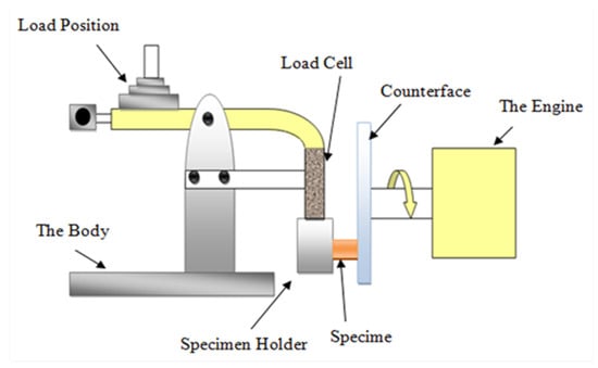 A tribological test on neat epoxy (NE) and bamboo/epoxy composites was conducted using a universal tribology machine at University of Southern Queensland, Figure 5. The experiments were conducted on block on desk configuration. Load cell was fixed on the arm of the configuration to measure frictional force between the rubbing surfaces and a digital friction sensor was used to capture frictional readings every second with the aid of data acquisition system. Before conducting the test, prepared samples and the counterface surface were polished using sand paper with grade of 500G–2000G to ensure the intimate contact between the sample’s surface and the counterface surface. The specimen was fixed in the specimen holder, and then the desired speed and load were set using the control panel. In the tribology software application, a thermo-image camera with infrared thermometer were used to measure the interfacial temperature between the specimen and the counterface during the test. Adhesive dry sliding tests were conducted at room temperature (25 °C) and under different applied loads as well as different velocities. Examination of the warm surfaces of all specimens was conducted using a microscope after each test. A Mahr Perthometer device was used to measure the roughness profile of each sample to identify the effect of different parameters in terms of roughness values.
