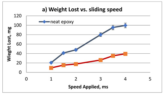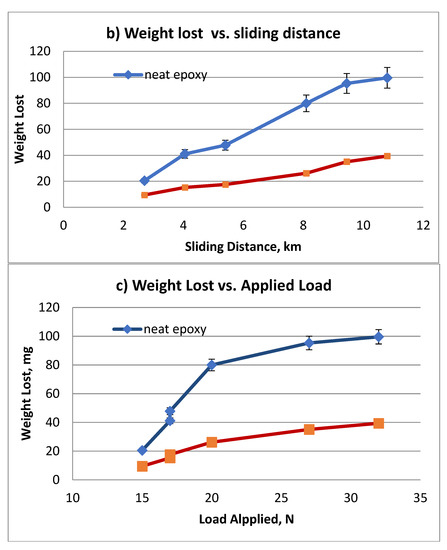 The wear performance of NE and the bamboo fibre reinforced epoxy (S-BFRE) as a function of weight lost vs. sliding distance at different counterface sliding velocities subjected to different applied normal loads is shown in Figure 6. The figure reveals that the weight lost is significantly sensitive to the sliding speed as well to the applied load (i.e., the weight lost increased as the speed or the load increased). In detail, the increase in weight lost for the NE is entirely more because of increasing speed, load or sliding distance. This result shows that reinforcing epoxy with bamboo fibre can improve the weight lost performance of the polymer composite.