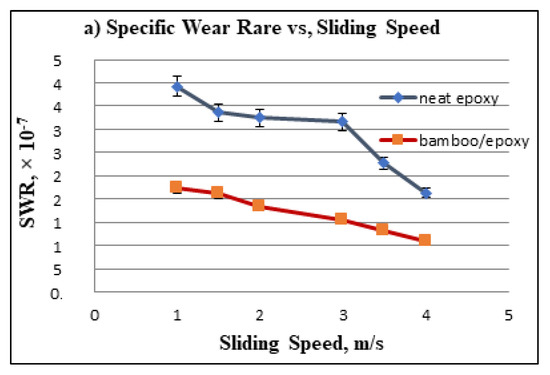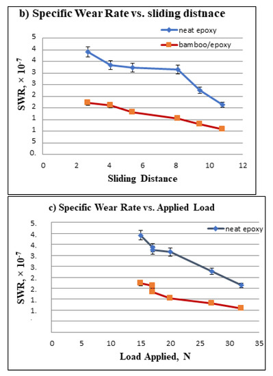 In addition, the SWR was studied for both NE and S-BFRE using the sliding distance at different counterface sliding velocities subjected to different applied normal loads, as shown in Figure 7. The figure reveals an inverse relationship between the SWR and the sliding distance, the sliding velocity and the applied load (i.e., as the sliding speed, the applied load or the sliding distance increased, the SWR decreased). In detail, the increase in the sliding distance, the applied load and the sliding velocity of the S-BFRE composite yielded an SWR lower than that of NE, as shown in Figure 7. This result clearly shows that the SWR of the polymer (epoxy) improved because it was reinforced with a natural fibre (bamboo).