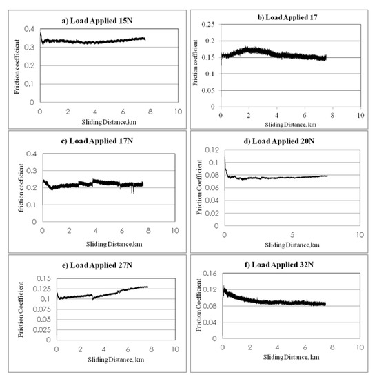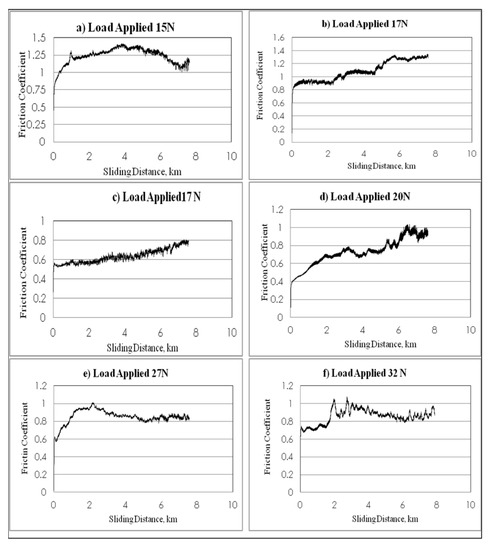 In detail, the NE tests showed a gradual increase in frictional values on increasing the sliding distances and sliding velocities. This is because of material lost from the specimen (weight lost) that increased at high sliding speeds. This has led to the possibility that a new material was present between the specimen surface and the counterface; this material calls the adhesive wear. Further, this phenomenon is known as “cold welding” or “rupture” caused by an uneven specimen surface. This new body material led to a coarse contact condition between the counterface and the specimen, which resulted in an increase in the friction coefficient between NE and the counterface, as shown in Figure 8. Conversely, the contact conditions in this test are considered dry conditions because no lubrication was used in this test.