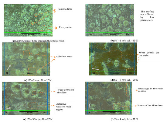 A close examination of Figure 10b indicates that at 1 m/s sliding velocity and 15 N load, there was a very small deformation in the S-BFRE composite surface, which was associated with the low operational parameter. However, as the sliding velocity and the normal applied load were increased to 2 m/s and to 17 N, respectively, there was adhesive wear associated with wear debris scattered on the resin region, as shown in Figure 10c. However, there seems to have been no damage to the fibrous region (i.e., the operational parameters still had no effect on the bamboo fibre). In contrast, the microscope image clearly revealed that as the sliding speed increased to 3 m/s and the normal applied load to 20 N, adhesive wear, as indicated by wear debris, appeared in the resin region of the tested specimens (see Figure 10d). In addition, Figure 10e indicates evidence of adhesive wear, at 3.5 m/s sliding speed and 27 N normal applied load, on the specimen surface and on the fibrous region as well. The effects of testing at 4 m/s sliding velocity and 32 N normal applied load are illustrated in Figure 10f. The microscope image reveals a tear and a loss of bamboo fibre and a small breakage at the specimen edge. Further, the wear debris is scattered on the resin region as a burned layer. Thus, this image shows the effect of high operational parameters on the S-BFRE composite.
