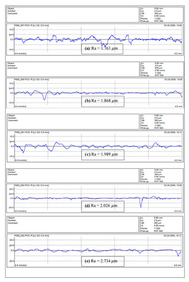 The roughness measurement of sample surfaces after each test is an important parameter that can help to evaluate the experiment results. The Mahr Perthometer was used to measure the roughness profile of all samples. Further evaluation is presented using the roughness profile of selected samples. The results from each test were recorded both in and against the direction of the counterface. In detail, Figure 11 shows that each test yielded different roughness values (i.e., at different sliding distances, speeds and applied loads, the roughness values differed). The values differed because an increase in the applied load led to deeper deformation in the specimen surface, such that very rough surfaces had high roughness values. Further, the roughness values of the S-BFRE composite were significantly higher than those of NE.