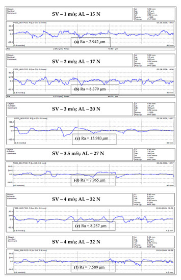 The roughness profile of the S-BFRE composite is presented in Figure 12. These were significantly higher than the corresponding NE values. In detail, Figure 12a shows that at the sliding speed of 1 m/s and the applied load of 15 N, the roughness value is 2.942 ; in contrast, as Figure 11a shows, at the same parameters the NE roughness value is 1.763 . Moreover, on increasing the sliding speed to 3.5 m/s and the applied load to 27 N, the roughness value is 8.257 for S-BFRE, as shown in Figure 12e, but only 2.734 for NE, as shown in Figure 11e. Two potential reasons account for this significant change in the roughness values. The first is that the rigidity of the S-BFRE samples may have increased because the samples were subjected to a high temperature before the tests. Thus, when the composite surface pushed against the counterface, it may have caused higher deformation in the surface areas in contact, which resulted in higher roughness values for the S-BFRE than for the NE. The second reason is that an increase in the sliding velocity or the normal applied load has significant effects on the roughness values (i.e., as the operational parameters increase, the roughness values also increase). These results highlight that factors such as the sliding speed, the applied load and the sliding distance have crucial effects on the roughness profile.