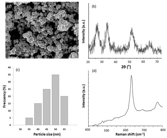 First, the pristine SnO2 nanoparticles were characterized by different techniques to obtain information about their structure, morphology and particle size (Figure 1). According to the SEM images (Figure 1a), the nanoparticles present quasi-spherical shape, and appear quite agglomerated, in the form of clusters comprising 2–5 particles. The surface hydroxyl groups of SnO2 have a strong tendency to create hydrogen bonds among nanoparticles, hence aggregation can occur, causing the formation of small clusters. The corresponding histogram shows nanoparticles with sizes ranging from 35 to 55 nm, and a mean diameter value of 47.5 nm. XRD analysis of the nanoparticles (Figure 1b) revealed four characteristic diffraction peaks at 2θ angles of 26.7°, 33.9°, 38.0°, 51.8° and 66.1°, which could be indexed to (110), (101), (200), (211), and (301) diffraction planes, respectively, hence corroborating the cassiterite crystal phase with tetragonal rutile structure (JCPDS No. 41-1445), space-group symmetry of P42/mnm [30]. The unit cell consists of two Sn atoms and four O atoms. Each Sn atom is located among six O atoms which form a regular octahedron. O atoms are surrounded by three Sn atoms forming a triangle. The average crystallite size obtained from the full width at half maximum (FWHM) of the 110 plane according to the Scherrer formula [31] was 3.6 nm. On the other hand, the most important vibrations in the Raman spectra (Figure 1d) appear at 631, 691 and 767 cm−1, related to the A1g, B1g, and B2g nondegenerated modes, respectively, in which oxygen atoms vibrate in the plane perpendicular to the c axis. The spectra confirm high SnO2 purity. Furthermore, according to literature [32], the positions observed correspond to nanoparticles with average crystallite sizes in the order of 3.5–4.5 nm, in good agreement with the results from XRD analysis.