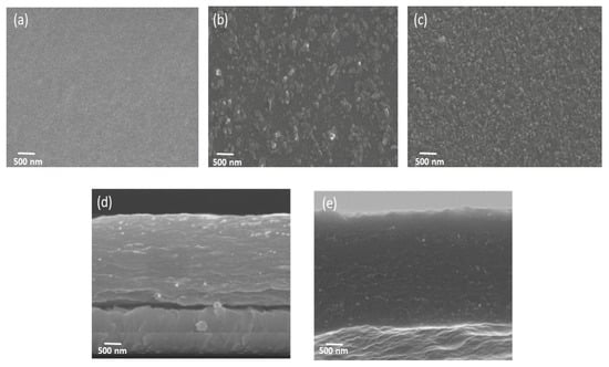 SEM images of neat PEDOT:PSS (a), PEDOT:PSS/SnO2 nanocomposites with 5.0 wt% SnO2 (b,d) and 10.0 wt% SnO2 (c,e), for a PEDOT:PSS ratio of 1:6. (a–c) are micrographs of the upper surfaces and (d,e) correspond to the cross section.