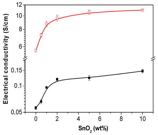 Electrical conductivity of PEDOT:PSS/SnO2 nanocomposites vs. SnO2 loading for PEDOT:PSS ratios of 1:6 (black solid squares) and 1:2.5 (red open circles).