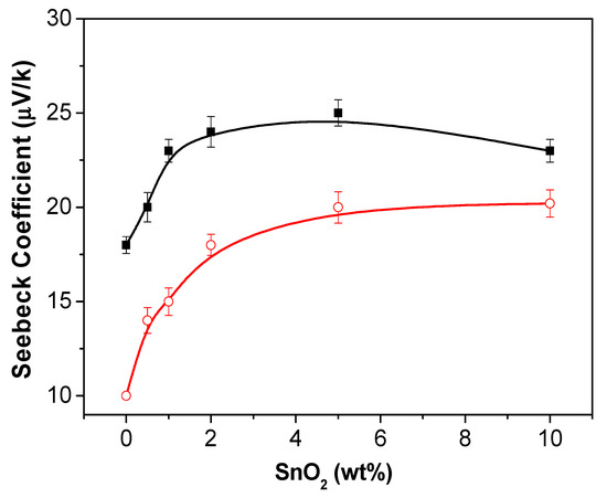 Seebeck coefficient of PEDOT:PSS/SnO2 nanocomposites vs. SnO2 loading. Symbols as indicated in Figure 4.