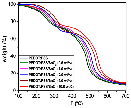 TGA curves under inert atmosphere of neat PEDOT:PSS (1:6) and the nanocomposites with different SnO2 loading.