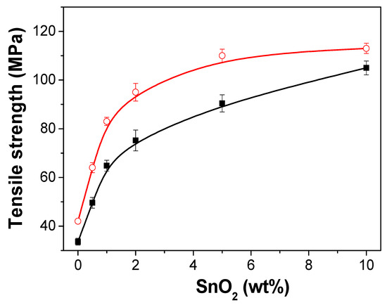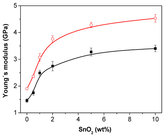 Taking into account the reported Young’s modulus for SnO2 [58], the theoretical Young´s modulus values for the nanocomposites were estimated by the modified rule of mixtures [60]: Ec = (η Ef − Em) Vf + Em, where η is a particle-strengthening factor (0.2 for randomly oriented fillers, Ef the filler modulus, Em the matrix modulus, and Vf the filler volume fraction). Surprisingly, experimental data of composites with 0.5, 1.0, and 2.0 wt% are about 6, 22, and 15% higher than the calculations, that with 5.0 wt% is in perfect agreement with the predictions, while that with 10 wt% is about 35% lower than the expectations. The discrepancies are likely due to the fact that the model assumes perfect adhesion between the phases and that stress is transferred via a shear mechanism. However, fatigue, stress amplification, strain localization, and other phenomena can take place at the interphase, which are not considered in the equations [61], and this could account for the differences between the theory and experimental data. Furthermore, the model assumes that the modulus of each phase is independent and remains unchanged by the presence of the other components, while at higher loadings, interactions among nanoparticles can take place, which reduce the load transfer efficiency.