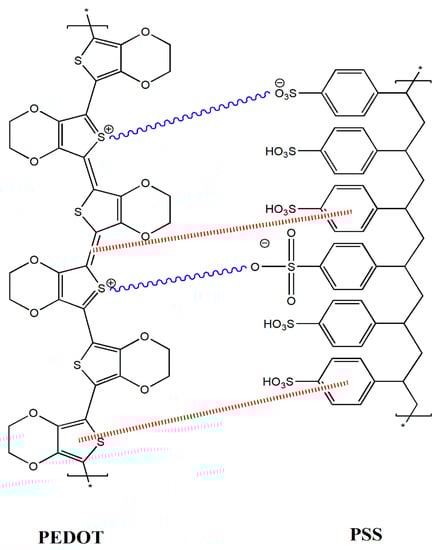 Conducting polymers constitute a type of organic polymers that can be semiconductors or display metallic conductivity, and usually present beneficial properties for processing (solubility and good film forming ability), which makes them suitable for a comprehensive range of applications in energy storage and conversion electronic [1,2]. Poly(3,4-ethylenedioxythiophene):poly(styrene sulfonate) (PEDOT:PSS) is the most successful conducting polymer in terms of practical applications. It is a polyelectrolyte comprising negatively charged insulating PSS and positively charged electrically conducting conjugated PEDOT. The positively charged thiophene rings of PEDOT can interact with negatively charged sulfonyl groups of PSS via electrostatic interactions. Furthermore, the double bonds of PEDOT and its aromatic thiophene rings can interact with aromatic rings of PSS via π–π stacking (Scheme 1). PSS polymer anions can stabilize conjugated polymer cations in water and some polar organic solvents. Consequently, it possesses outstanding properties, such as water solubility, good processability, high electrical conductivity, superior optical transparency in the visible light range, flexibility, and good physical and chemical stability in air. However, it presents some drawbacks such as acidity, hygroscopic character, and heterogeneous electrical properties, which lead to short durability and limit device efficiency [3]. Furthermore, its thermoelectric performance is poorer than that of inorganic counterparts [4]. The methods and mechanisms for enhancing the thermoelectric properties of neat PEDOT:PSS and its potential applications have been reviewed [5,6].