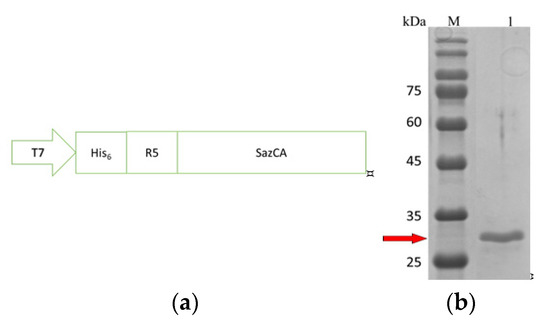 Gene construction and purification of R5-SazCA. (a) Schematic of the gene; (b) SDS-PAGE; lanes: M, marker; 1, purified R5-SazCA.
